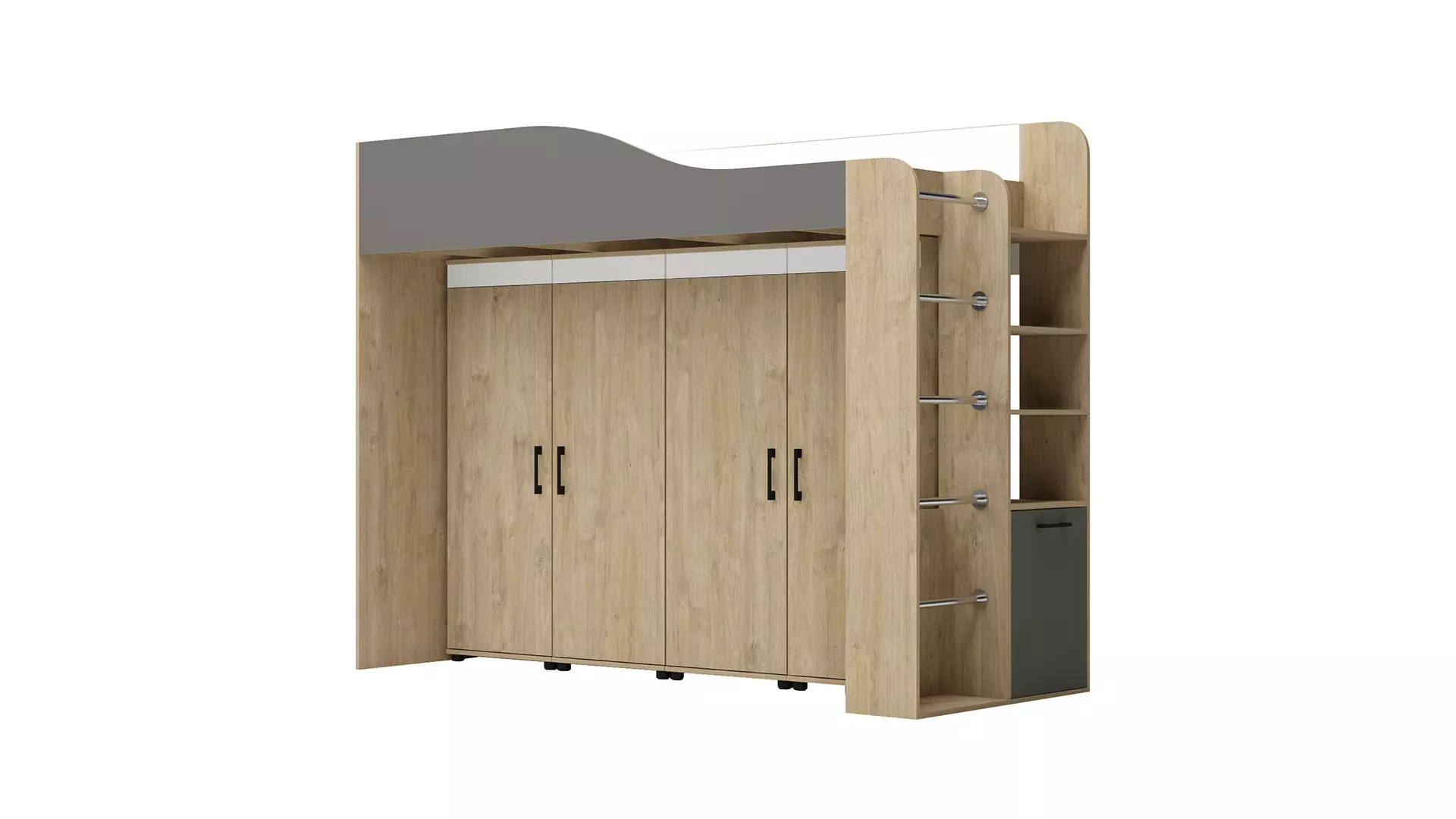 Модулна система Крис е стилно предложение за обзавеждане на детска стая. Конфигурацията включва горно легло с шкаф и стълба, и 4 броя висок шкаф М10. Леглото е подгодящо за матрак с размери 90/200 см. Вратите са с плавно затваряне.