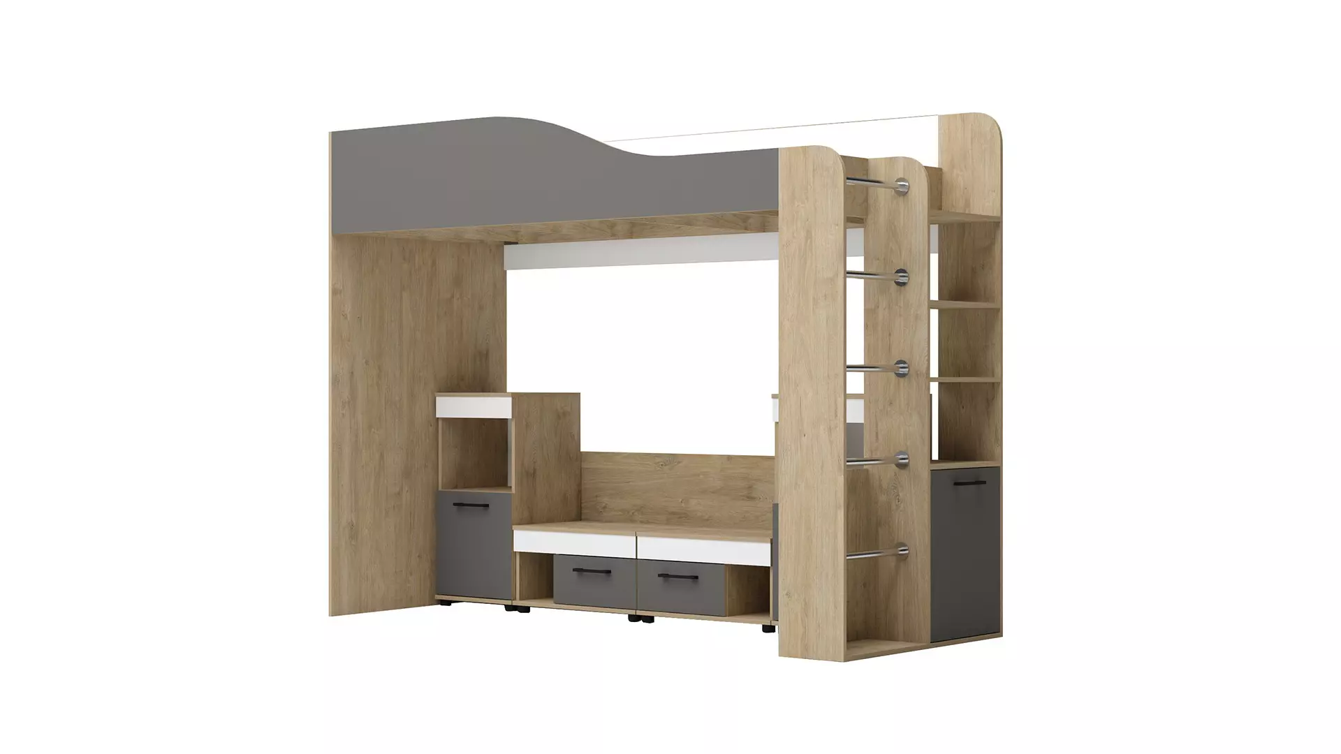 Модулна система Крис е стилно предложение за обзавеждане на детска стая. Конфигурацията включва горно легло с шкаф и стълба, 2 броя нисък шкаф М12 и две нощни шкафчета М8 и М9. Леглото е подгодящо за матрак с размери 90/200 см. Вратите са с плавно затваряне.