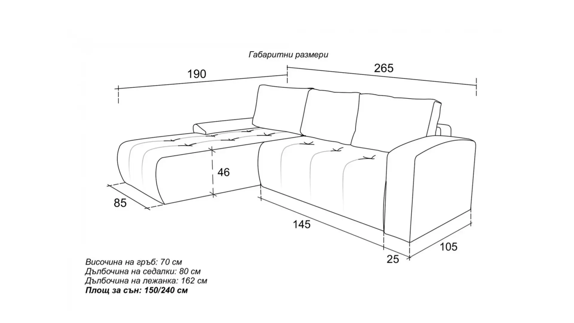 Материали: Масивно дърво, МДФ и пенополиуретанова пяна; облегални възглавници от силиконов пух, пенополиуретанова пяна