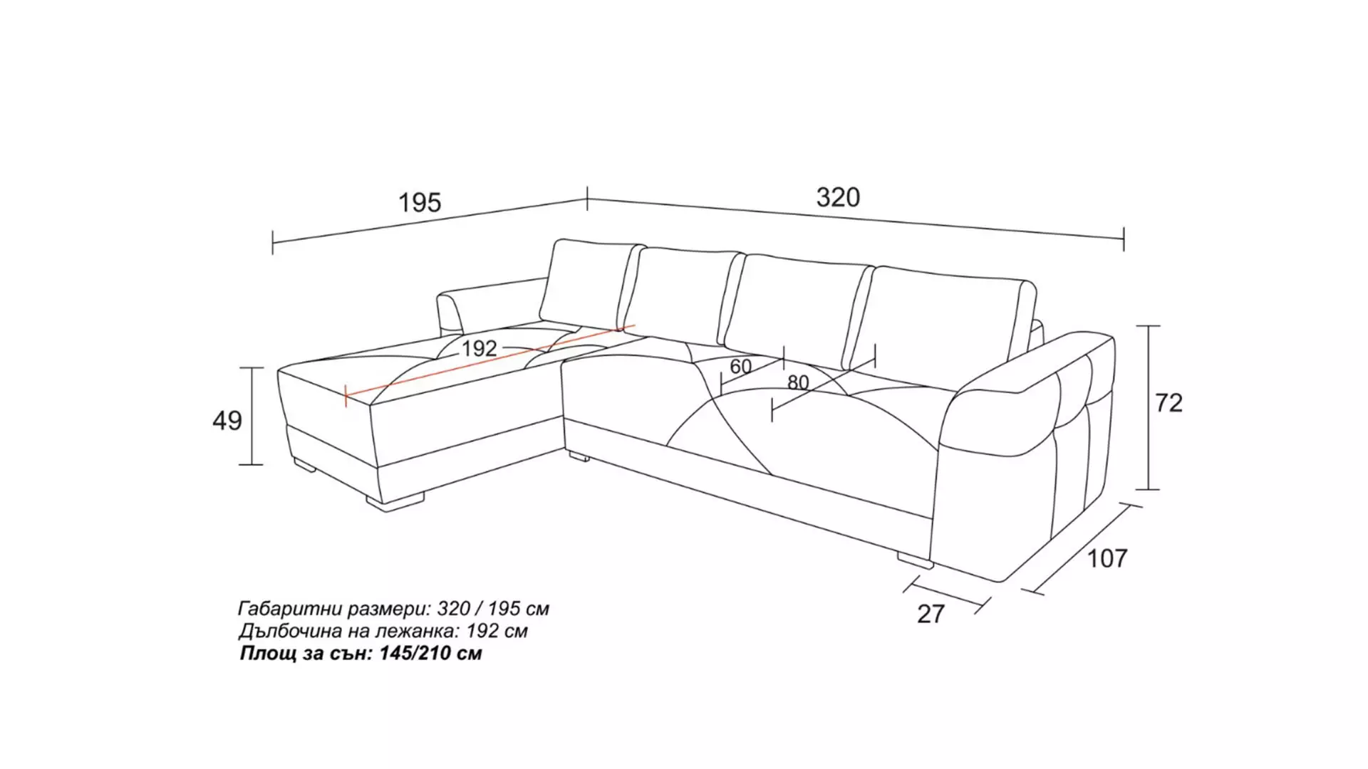 Размери: 320/195/72 см