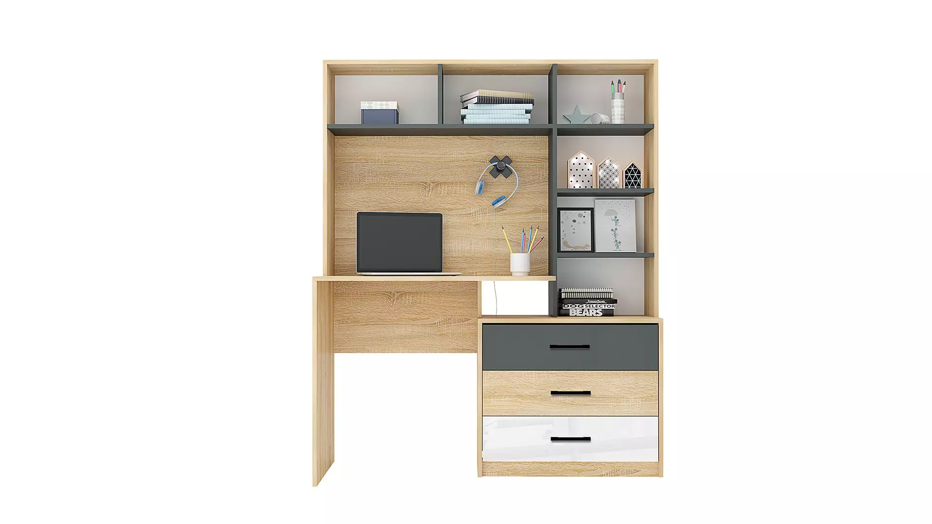 Бюрото е част от модулна система Сидни за обзавеждане на детска стая, разполага с три чекмеджета и етажерка.