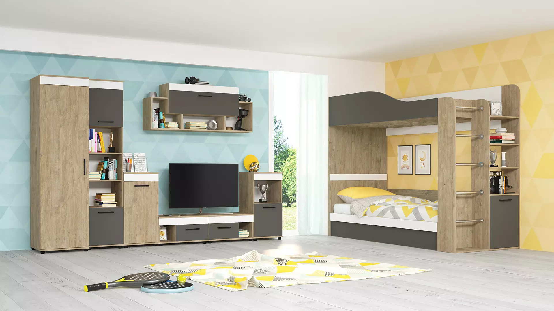 Модулна система Крис включва всичко необходимо за обзавеждане на детска стая. Вратите са с плавно затваряне.