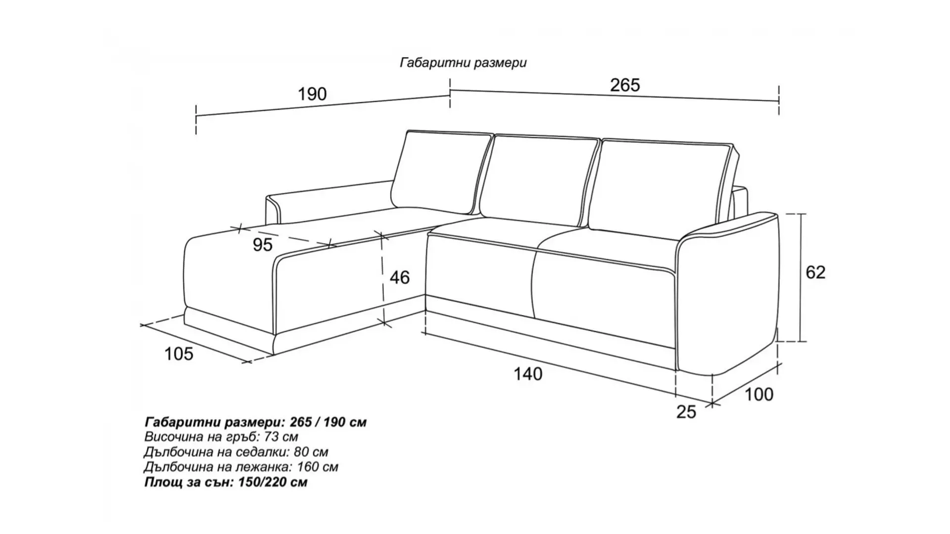 Ъглов диван Мини Дъблин с елегантната си и изчистена визия е идеално допълнение към интериора на дома ви. Седалките са с пружинен пакет тип Бонел, пенополиуретанова пяна с висока плътност. Възглавниците са от пенополиуретанова пяна, силиконизиран пух, калъфи с цип. Предлага се с функция за спане - изтегляща седалка и падащ гръб. Възможност за избор на лява или дясна конфигурация.