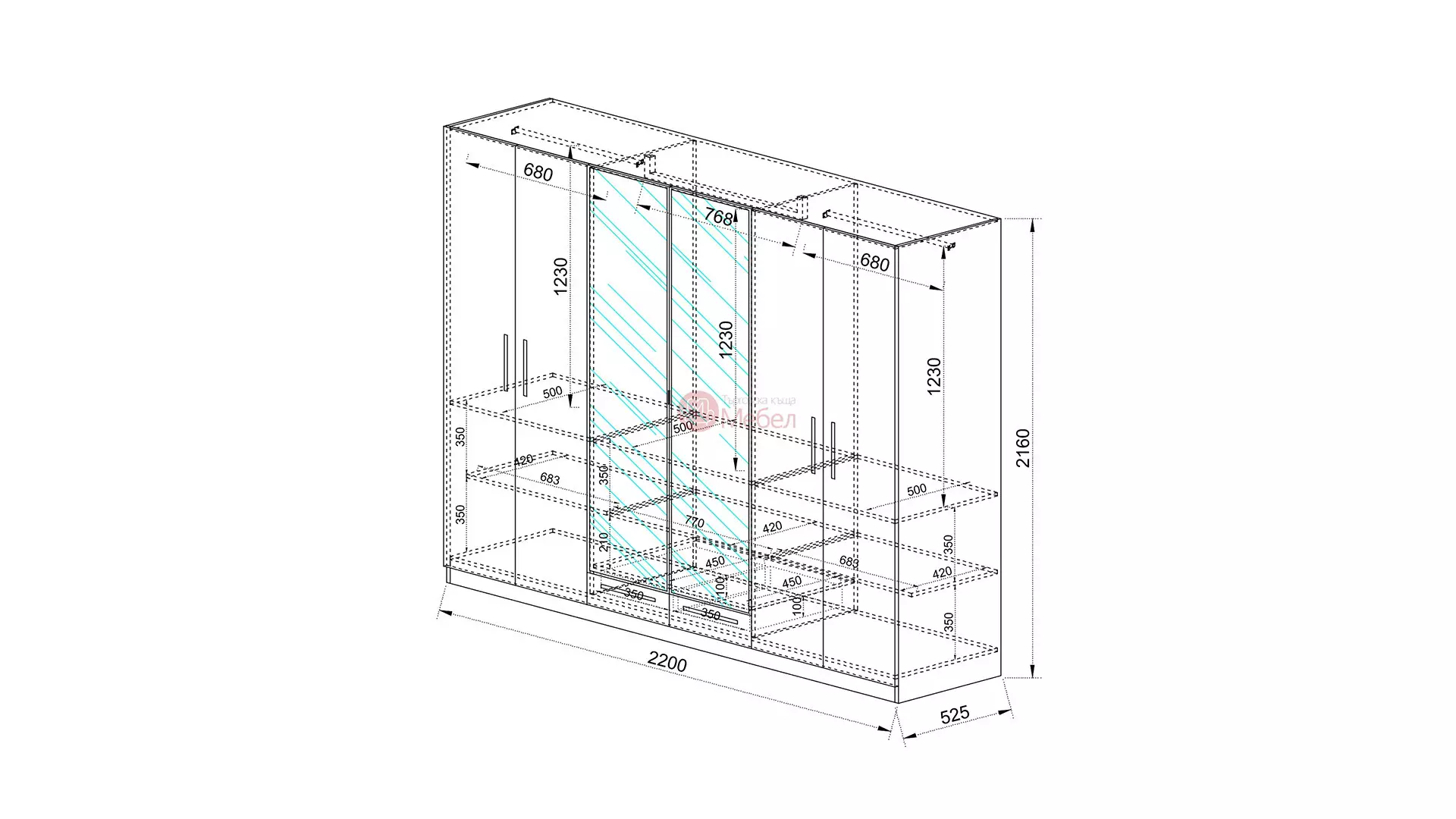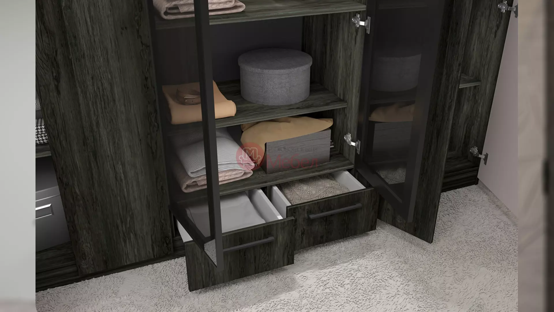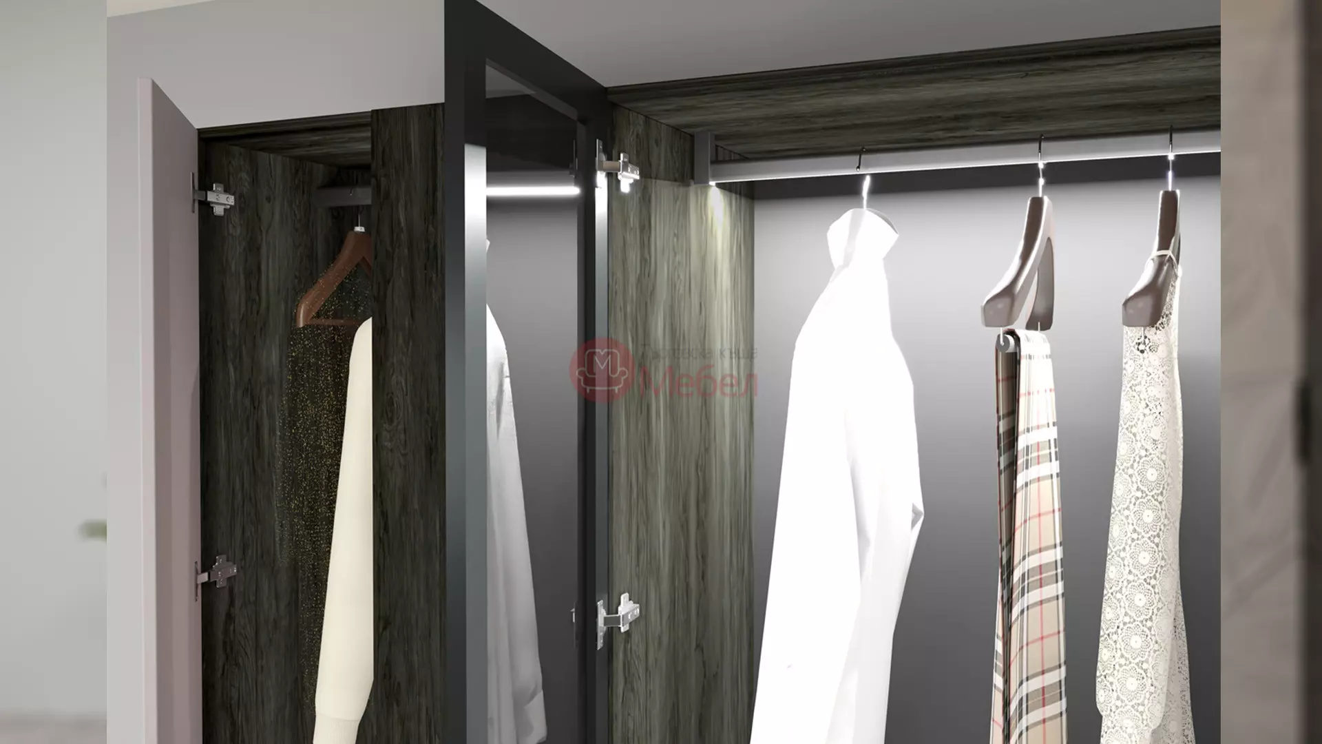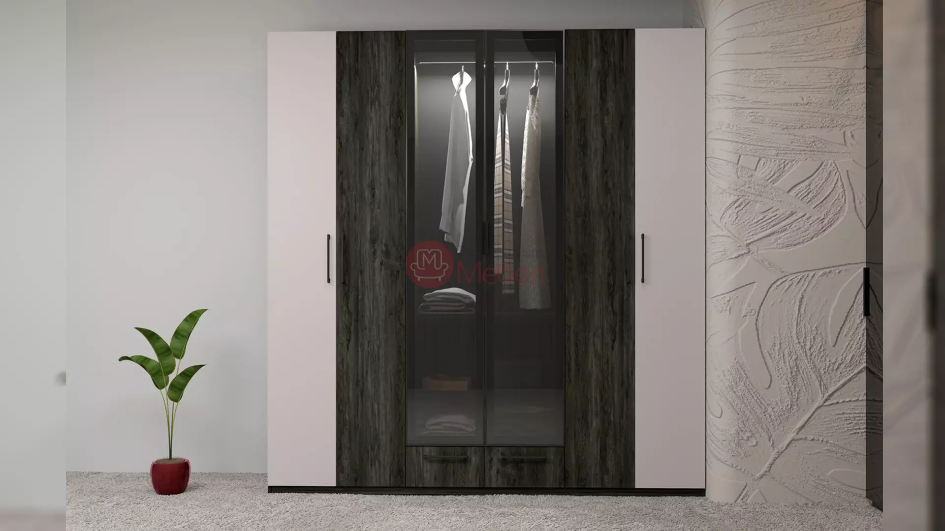 Гардероб Сити 1045 е с 6 врати - две от които са стъклени АлуГлас, с 2 чекмеджета и LED осветление на лоста. С монтаж към стената, вратите са с плавно затваряне. Гардеробът може да се комбинира чудесно с легло Сити 7088 с нощни шкафчета и скрин Сити 3093.