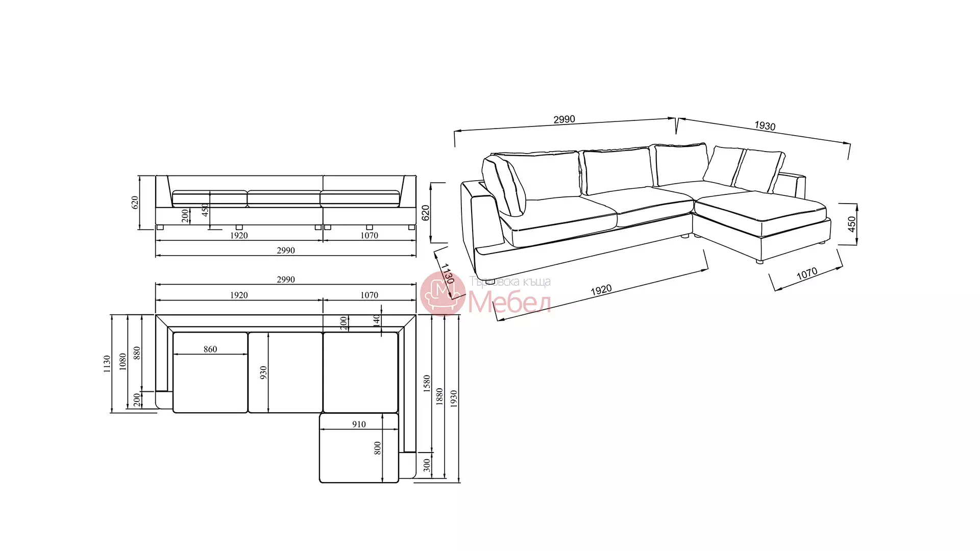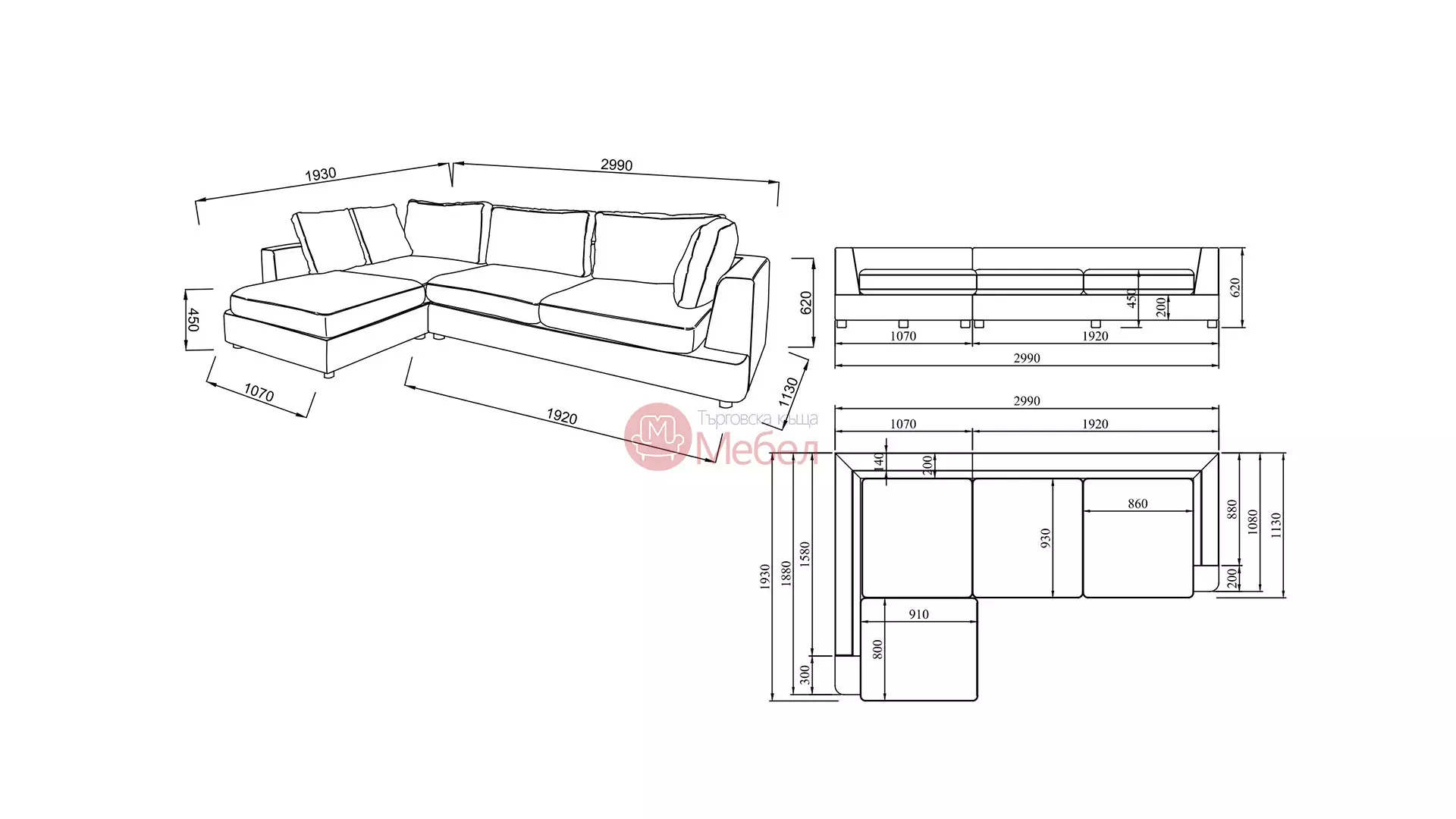 Ъглов диван Gondolo е с модерен дизайн, подходящ за заслужена почивка след натоварен ден. Изработен е от масивна конструкция от ПДЧ и дървесина, съчетана с мека пяна върху еластични колани. Възглавниците са с ципове и пълнеж от силиконов пух. Гърбът е тапициран. Диванът е неразтегателен, не предлага функция сън и ракла за багаж. Възможност за избор на лява или дясна конфигурация.