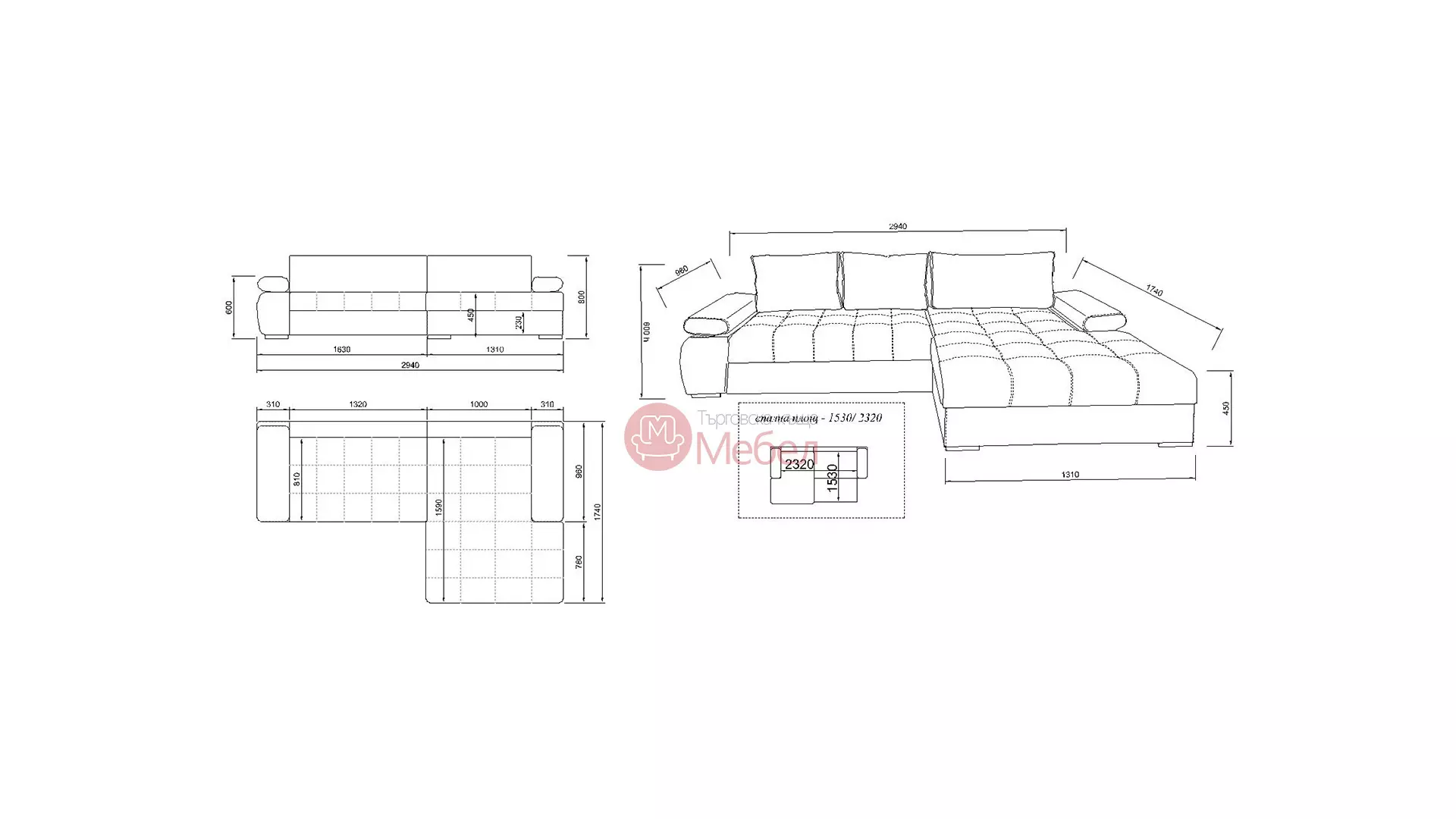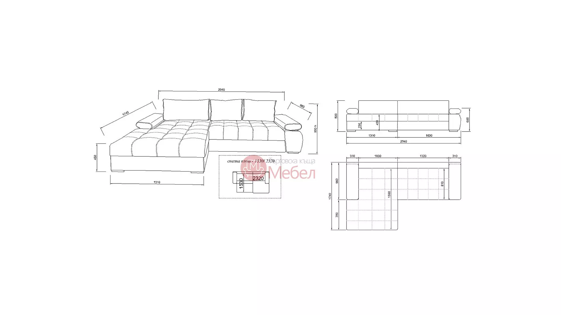 Размери: 294/174/80 см