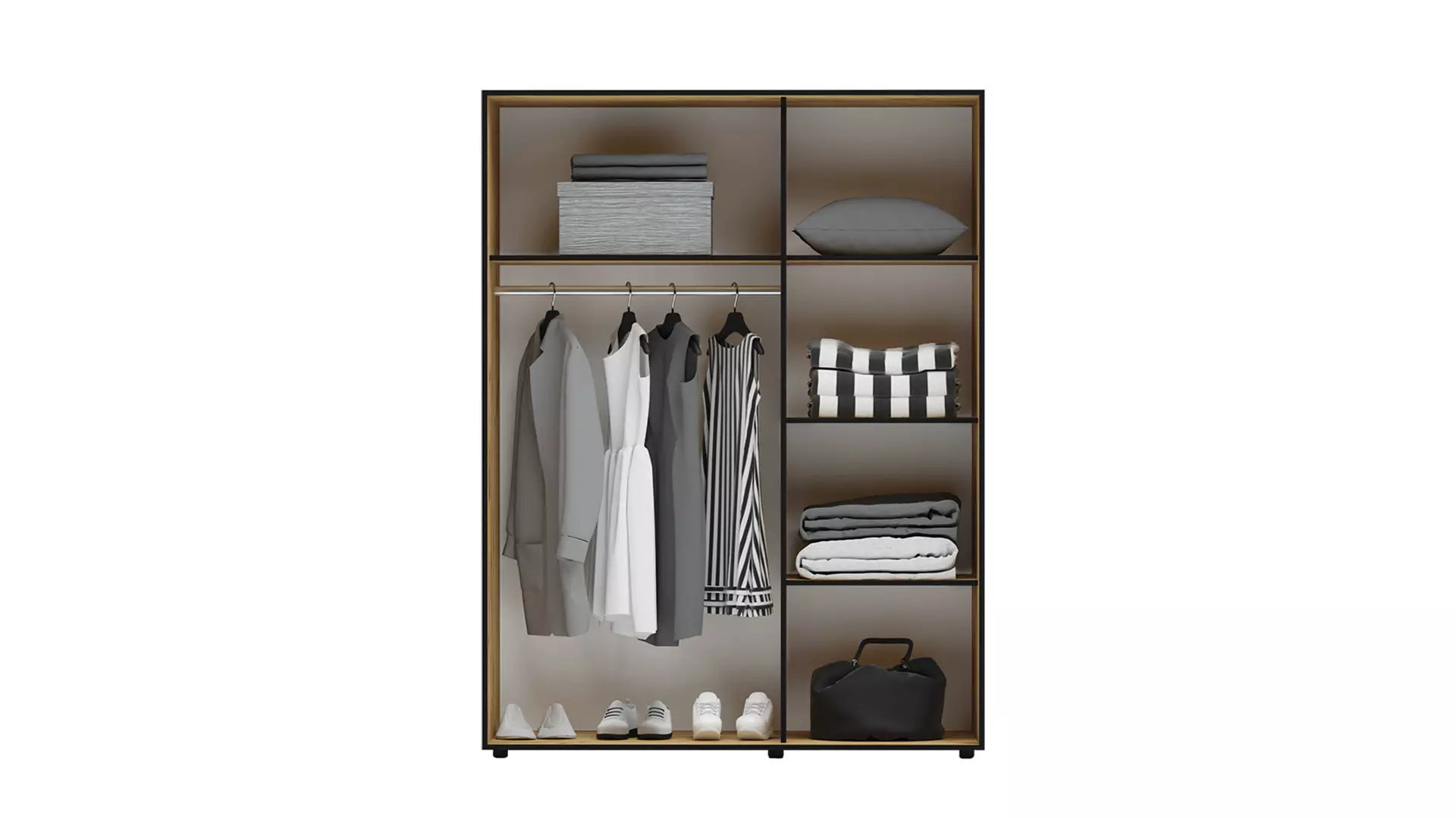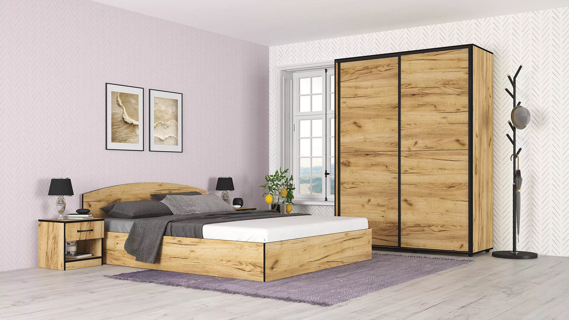 Спален комплект с изчистена и стилна визия, идеален избор за Вашата спалня. Може да използвате цялото подматрачно пространство на леглото за съхранение на вещи. Гардеробът разполага с отделение с лост за закачалки и още едно с рафтове за Вашите дрехи.