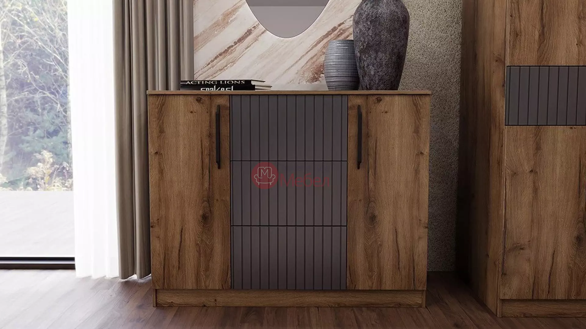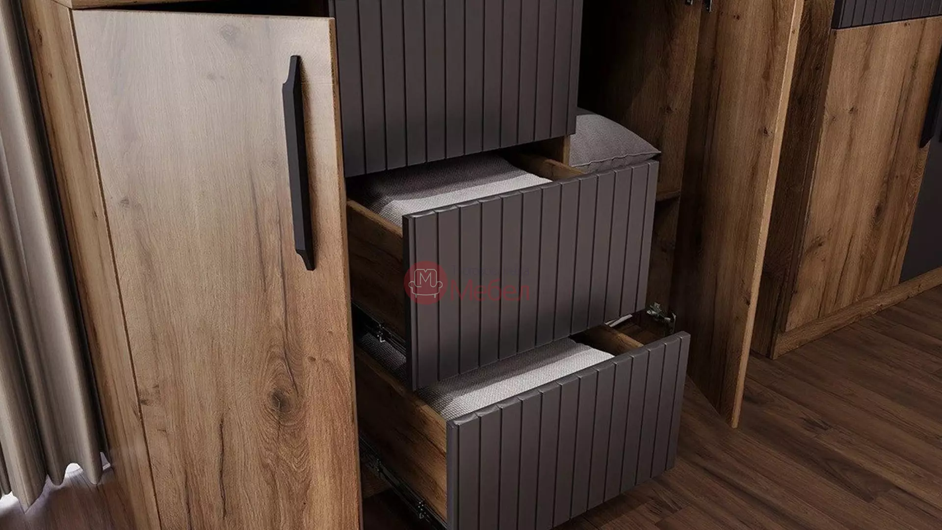 Скрин Дейт е отличен избор за модерния дом и чудесно допълнение към спален комплект Дейт. Скринът разполага с три просторни чекмеджета с push-to-open механизъм и две врати, осигуряващи оптимално вътрешно разпределение за подредба на дрехи или аксесоари. Дръжките на вратите са в стилен черен мат, който подчертава модерната визия.