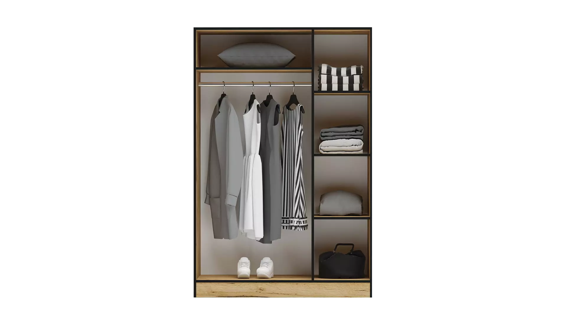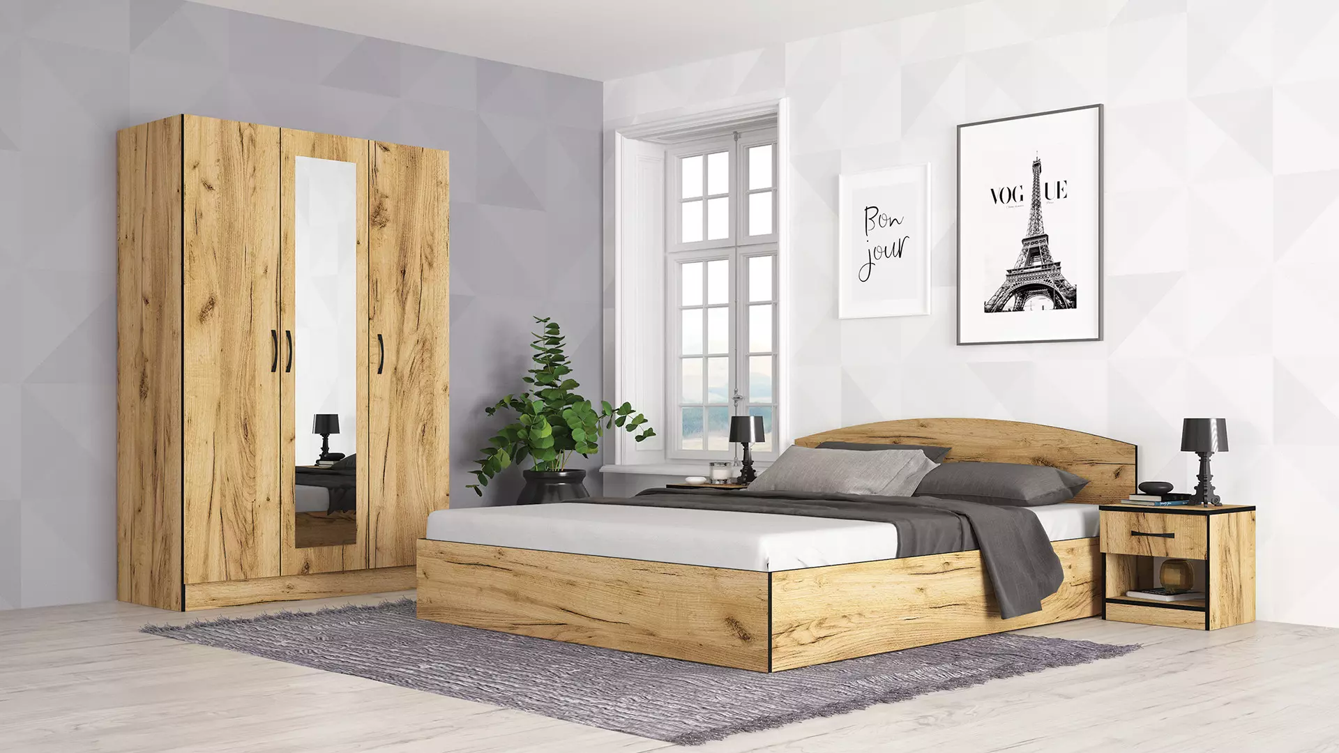 Спален комплект Аполо 3 е функционален и с модерен дизайн, подходящ за Вашата спалня. Може да използвате цялото подматрачно пространство за съхранение на вещи. Леглото е подходящо за еднолицев матрак или за двулицев с подматрачна рамка. Гардеробът разполага с отделение със закачалки и още едно с рафтове за Вашите дрехи.