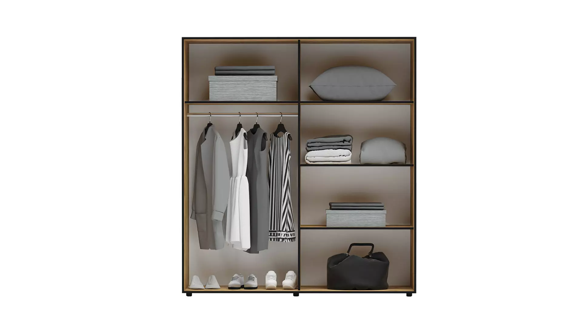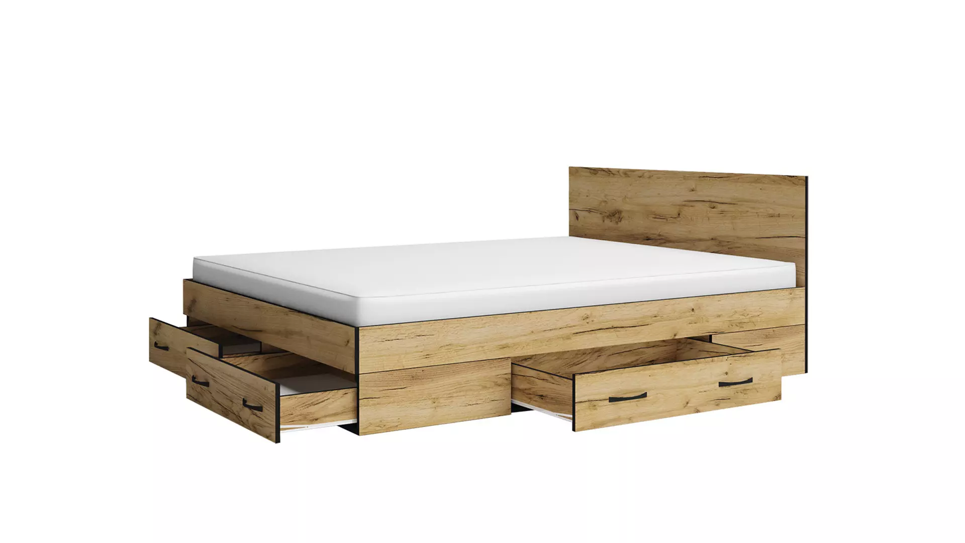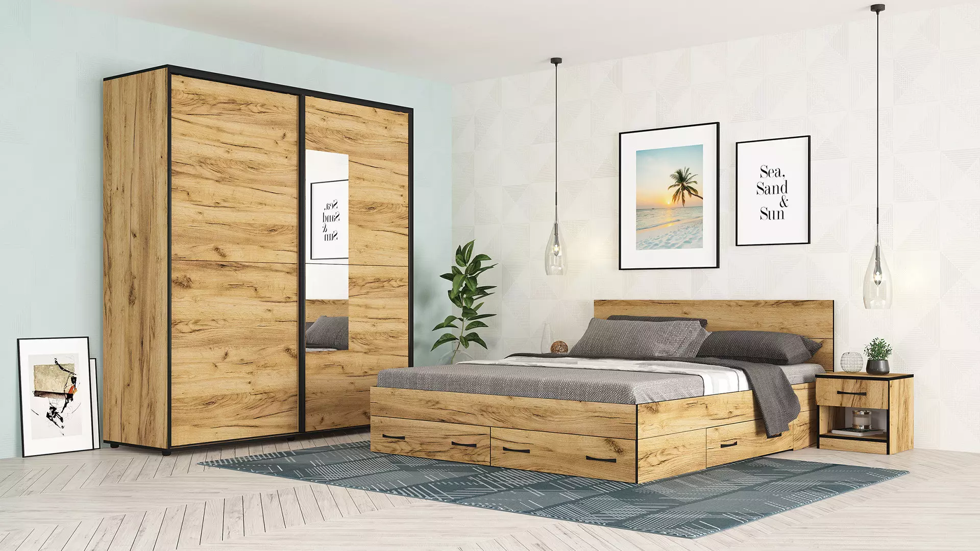 Стилен спален комплект Аполо 5, подходящ за Вашата спалня. Състои се от легло за матрак 160/200 см с чекмеджета, 2 нощни шкафчета и голям гардероб с плъзгащи врати с лост за закачалки и рафтове.