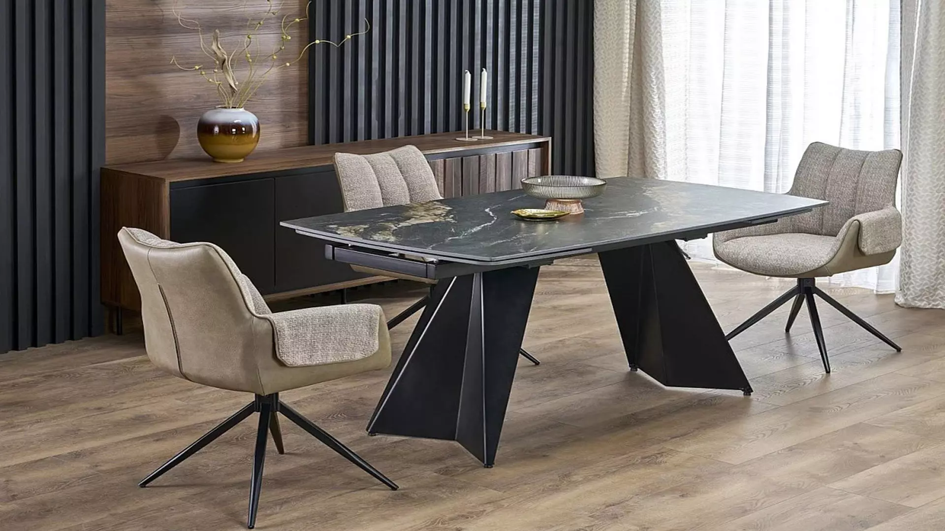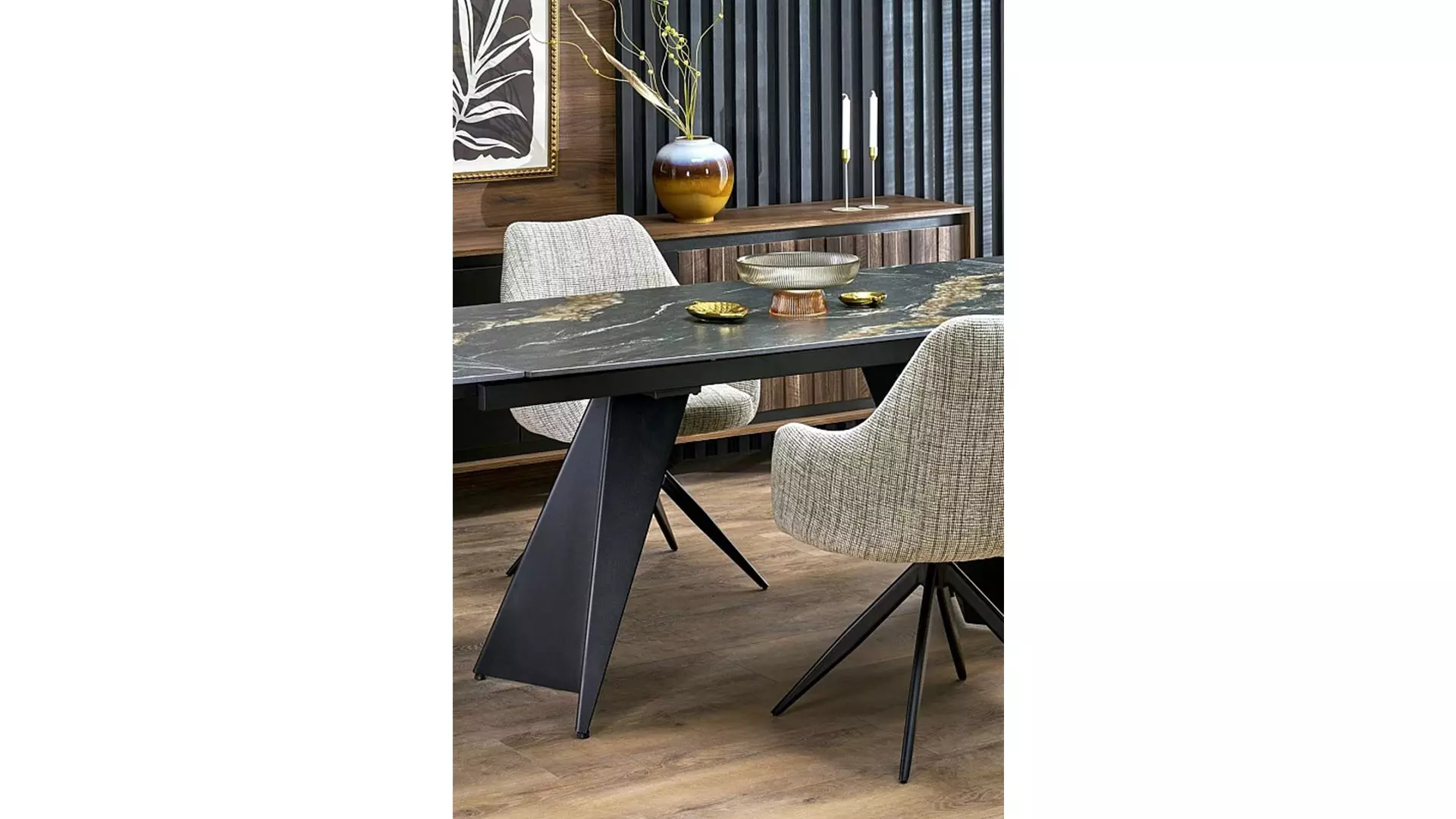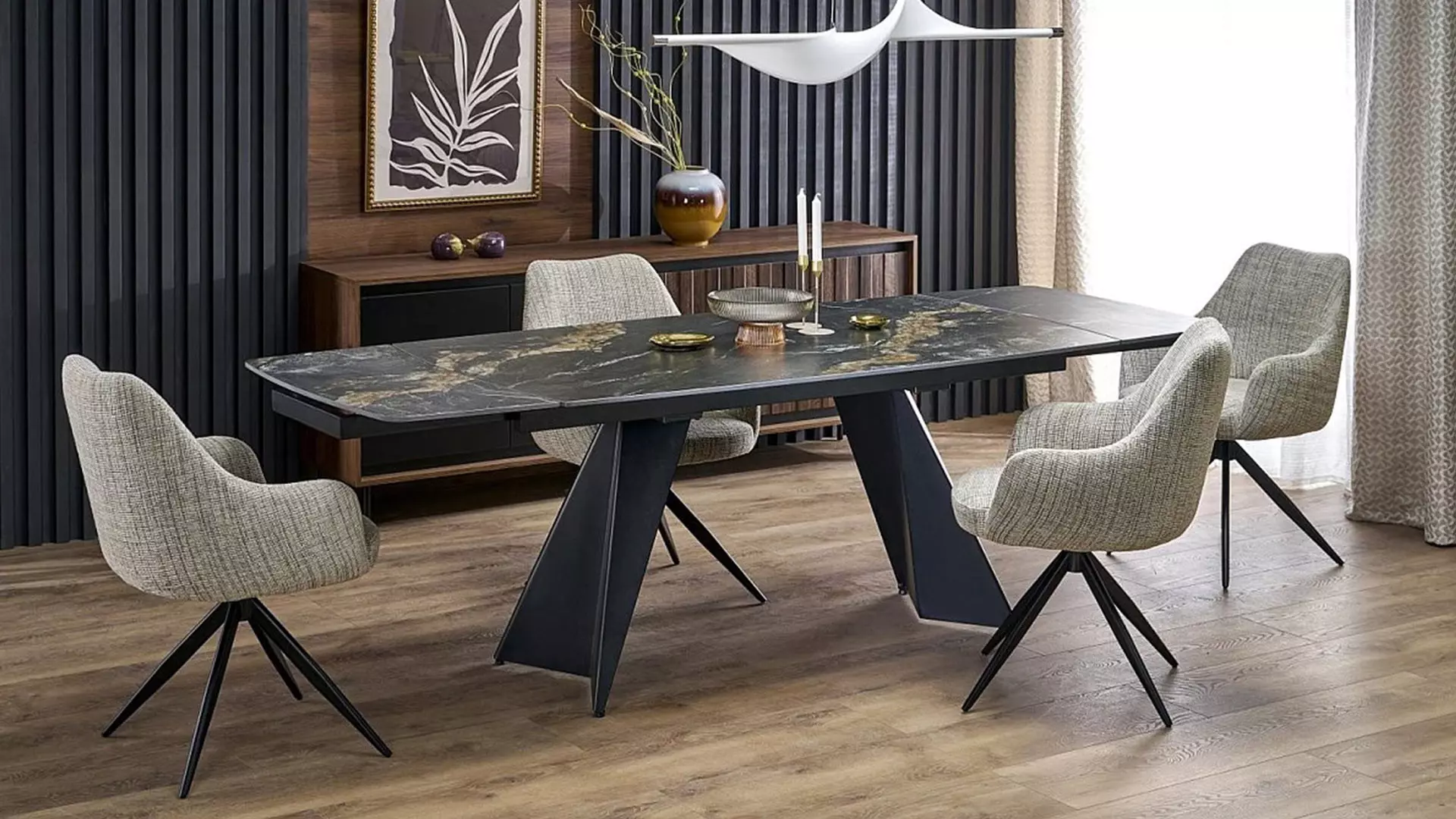 Разтегателна трапезна маса Armani е перфектен избор за всеки, който търси съвременна и елегантна мебел, която съчетава луксозен черен мрамор и синтерован камък. Тази маса е не само функционална, но и стилна, добавяйки нотка изтънченост и клас на всяко помещение.