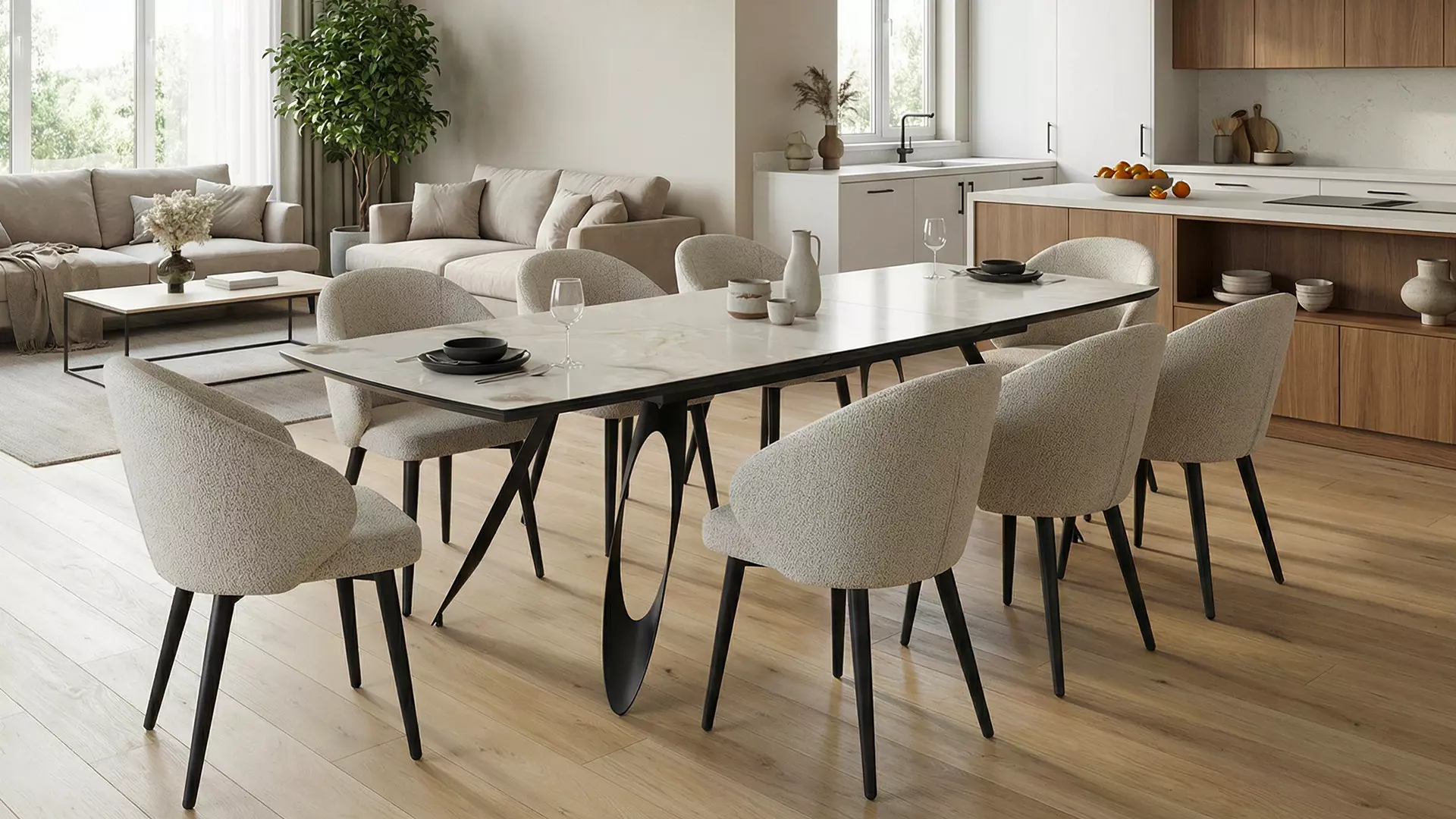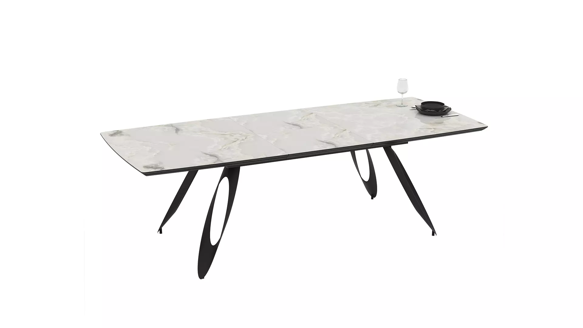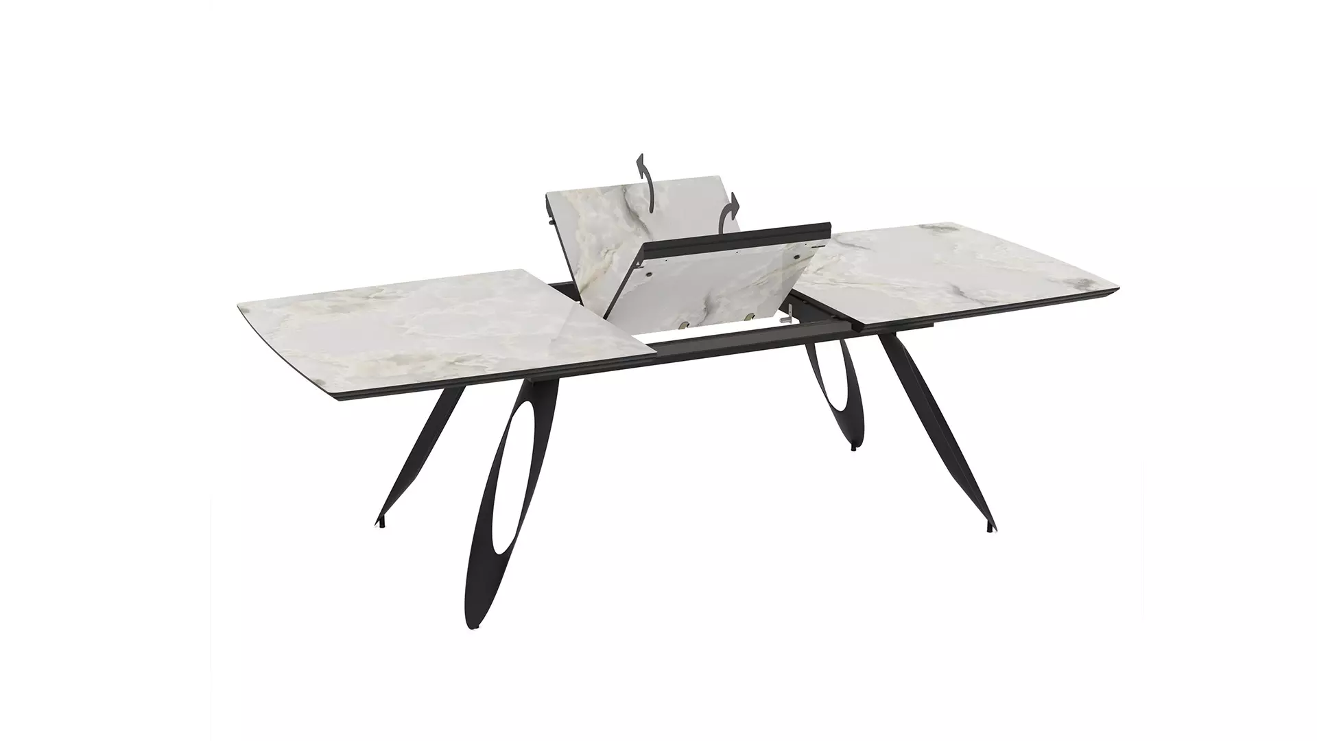 Трапезна маса Merkur е чудесен избор за дневната или трапезарията, съчетание между МДФ в бежов мрамор и прахово боядисана стомана. Със своя разтегателен плот със синхронен механизъм, тя предлага функционалност и елегантна линия, необходими за всеки изискан дом.
