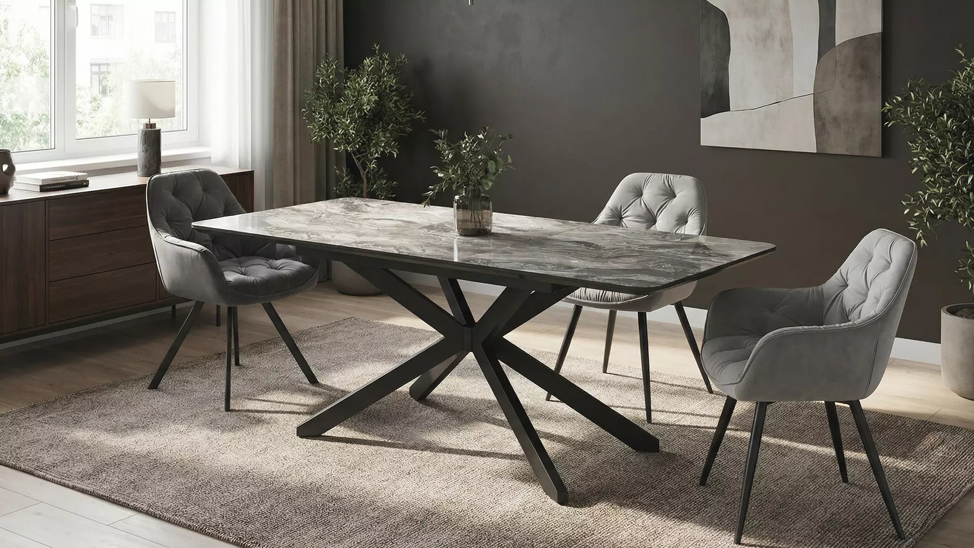 Mona е правоъгълна разтегателна маса с елегантен и изчистен дизайн, съчетание на масивна визия и практичност. Моделът е със стабилна метална конструкция и плот от МДФ в цвят черен мрамор, който е лесен за почистване и устойчив на надрасквания.