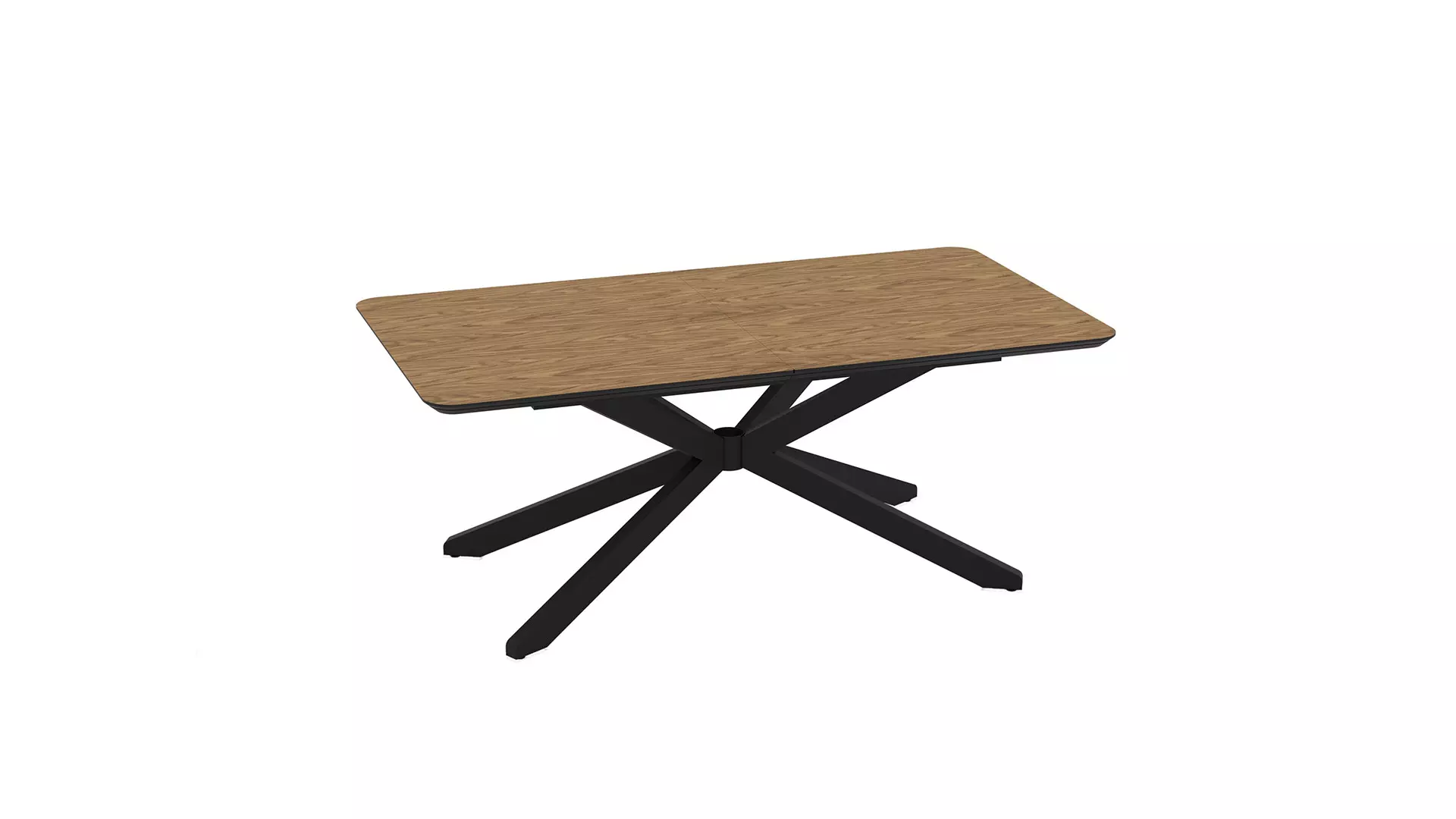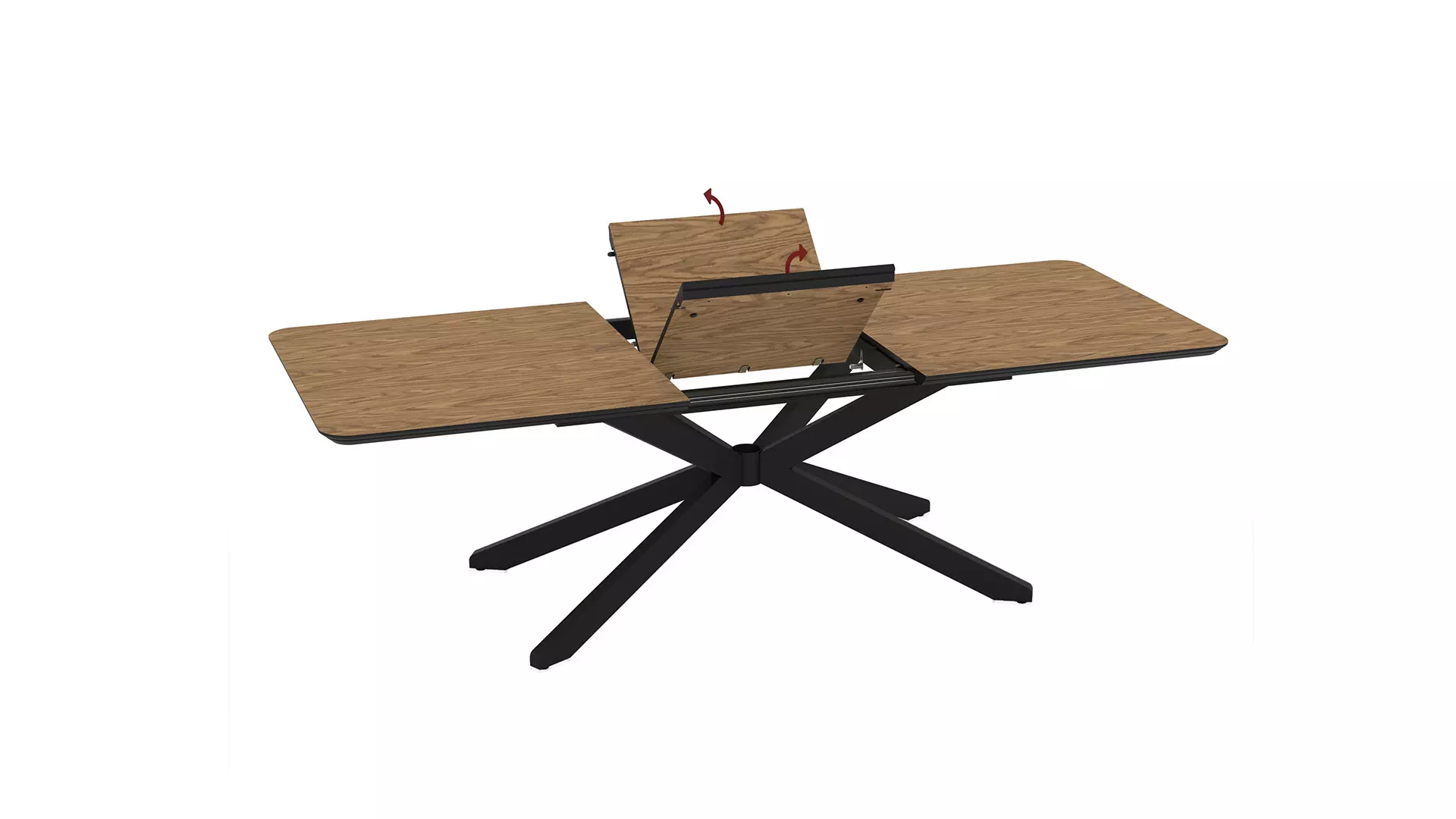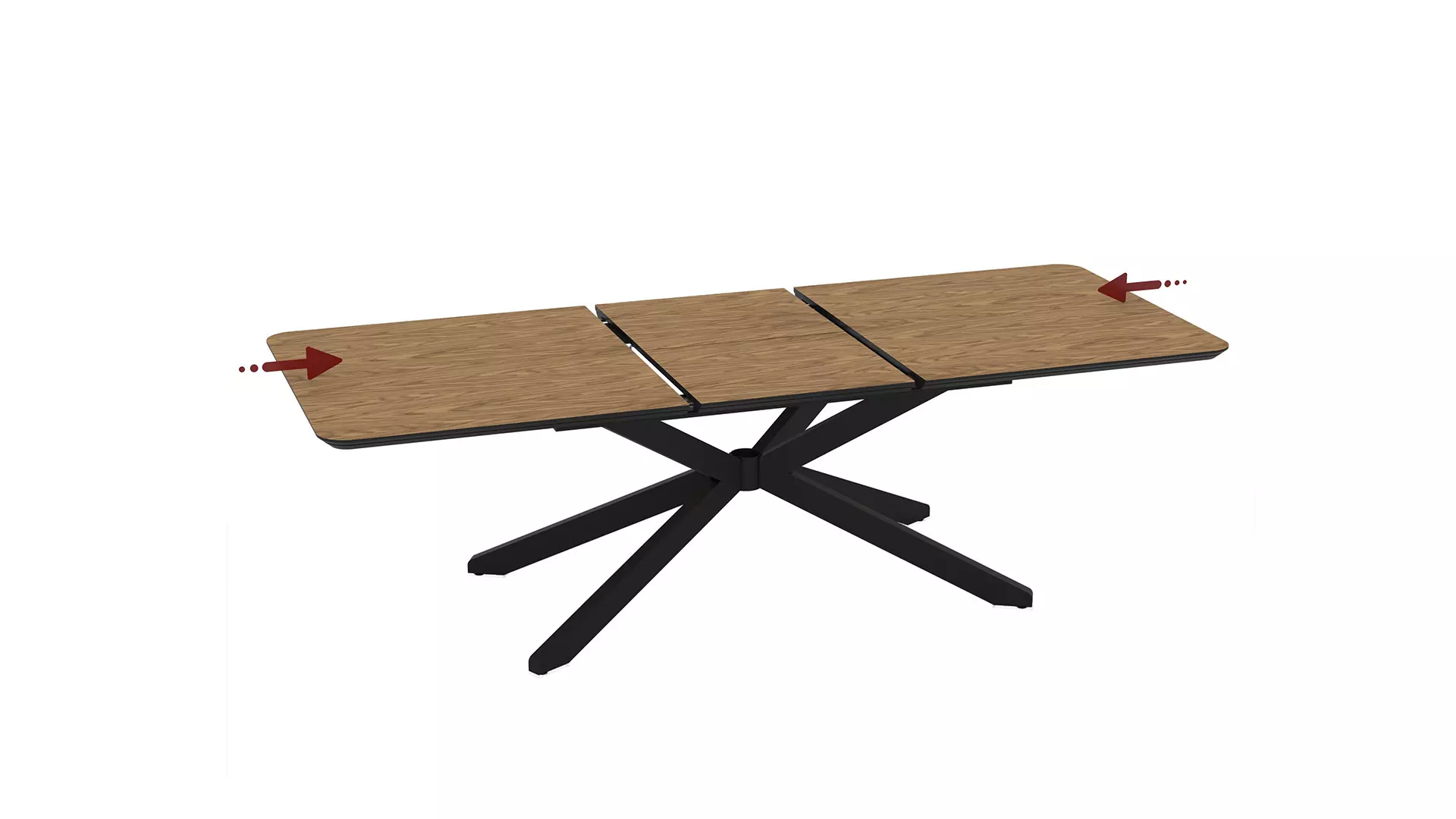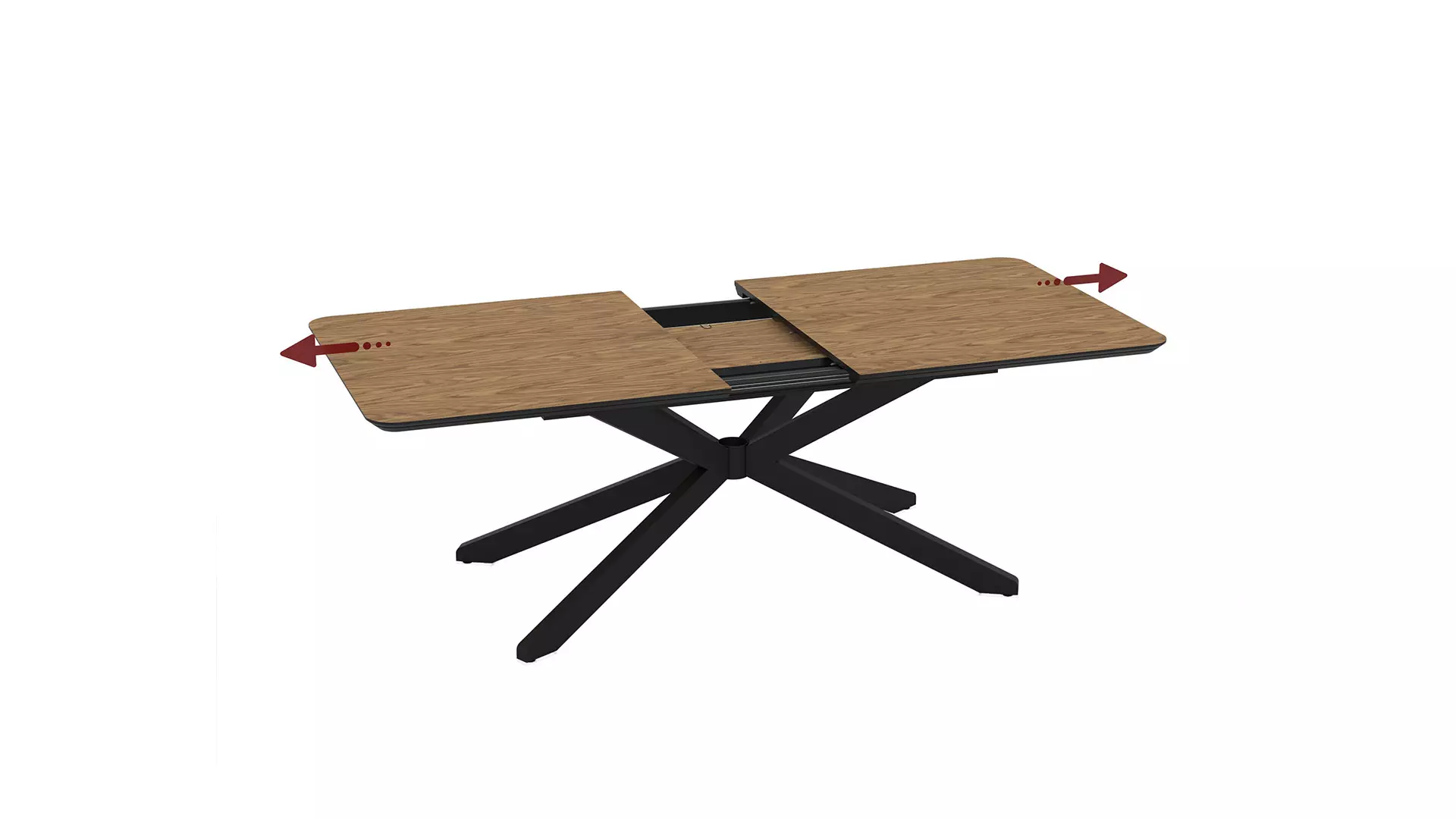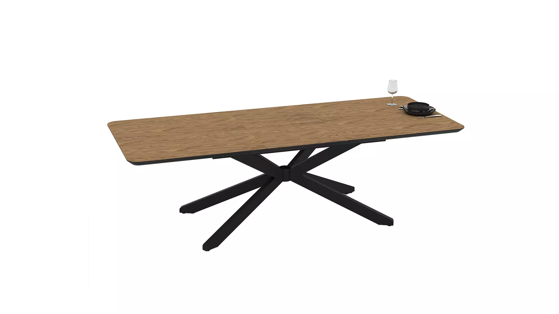 Mona е правоъгълна разтегателна маса с елегантен и изчистен дизайн, съчетание на масивна визия и практичност. Моделът е със стабилна метална конструкция и плот от МДФ в цвят меден дъб, който е лесен за почистване и устойчив на надрасквания.