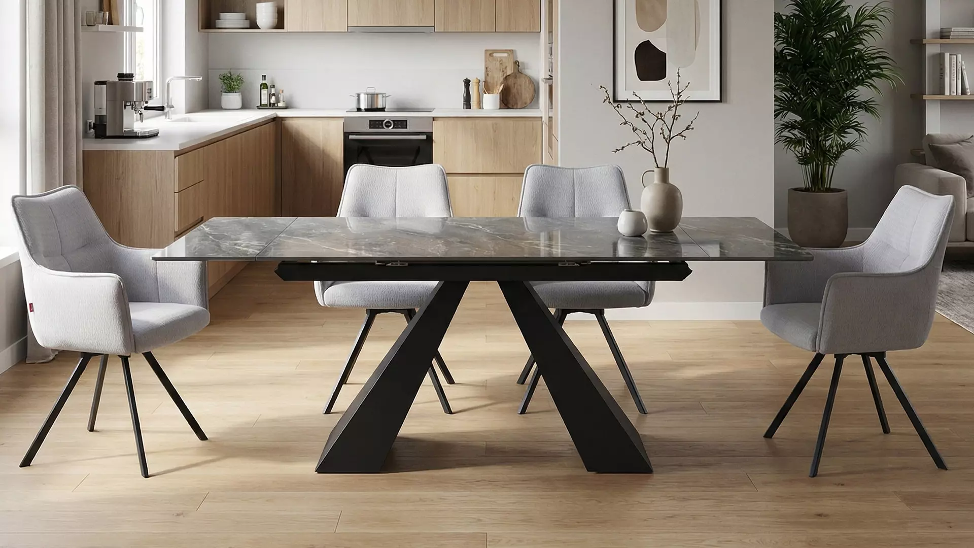 Разтегателна маса Monza е луксозен избор, съчетание на масивна визия и практичност. Моделът е със стабилна метална конструкция и плот 11 мм от синтерован камък в цвят сив мрамор, който е лесен за почистване и устойчив на надрасквания. Има два разтегателни плота по 40 см с механизъм за плавно прибиране.