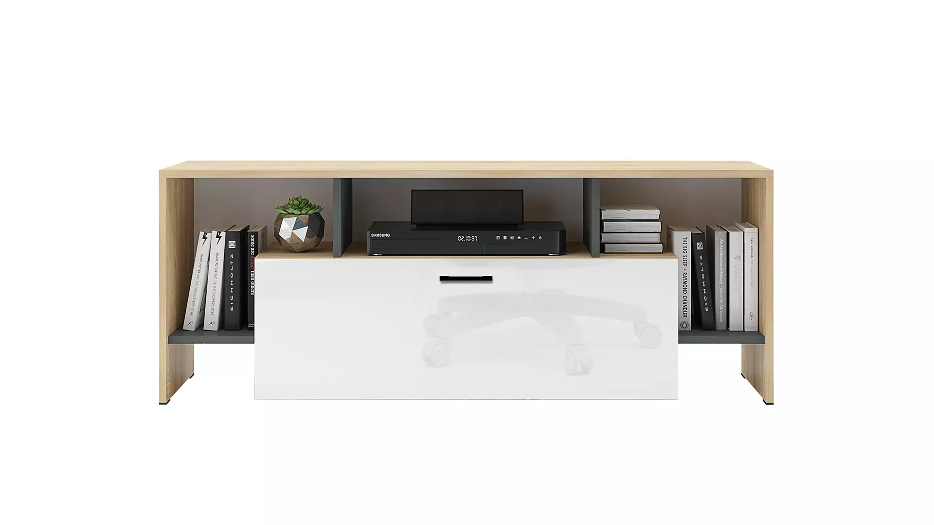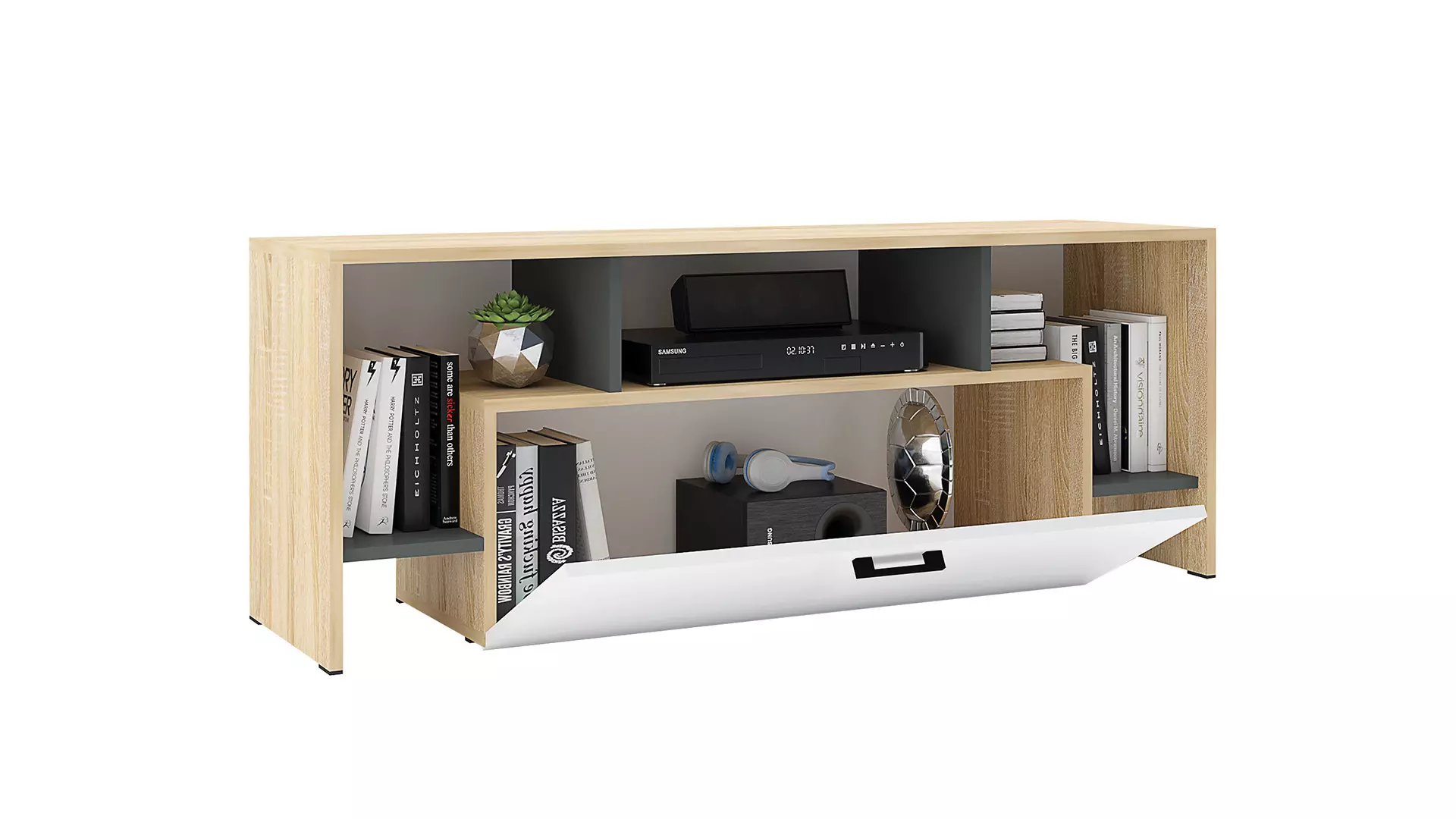 ТВ шкафът е част от модулна система Сидни за обзавеждане на детска стая, разполага с един шкаф с клапваща врата и ниши.